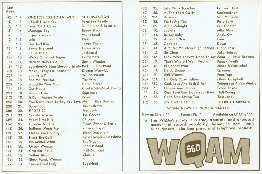 WQAM FABULOUS 56 SURVEY FOR WEEK ENDING NOV. 28, 1970 |