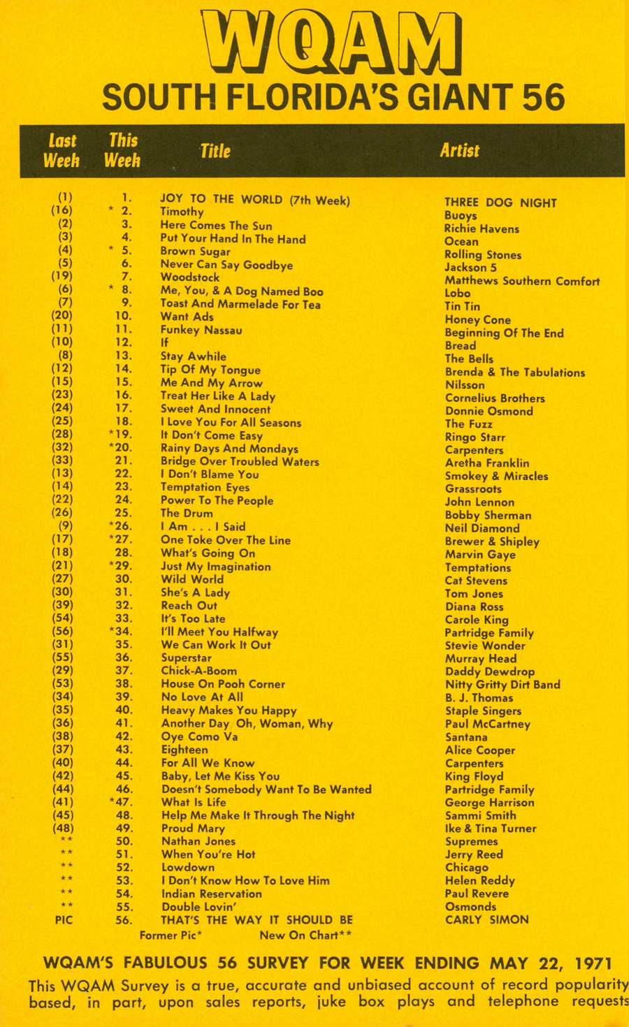 WQAM FABULOUS 56 SURVEY FOR WEEK ENDING MAY 22, 1971 |