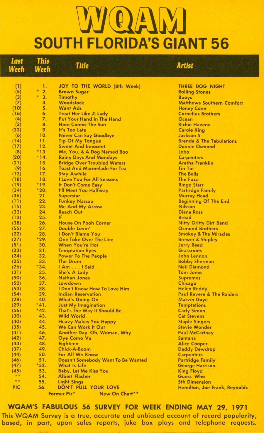WQAM FABULOUS 56 SURVEY FOR WEEK ENDING MAY 29, 1971 |