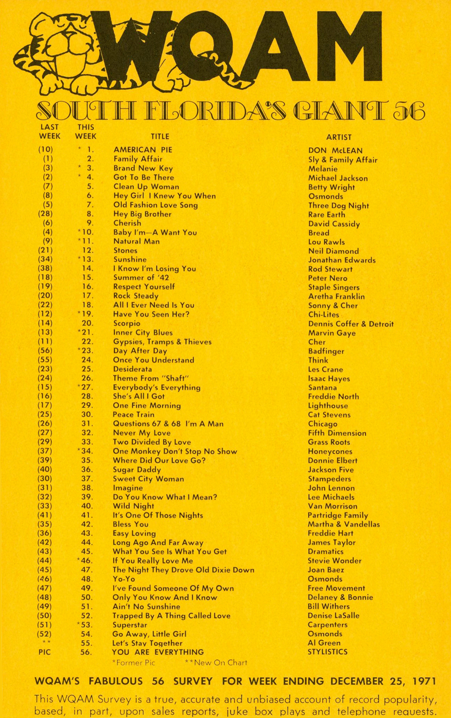 WQAM FABULOUS 56 SURVEY FOR WEEK ENDING DEC. 25, 1971 |