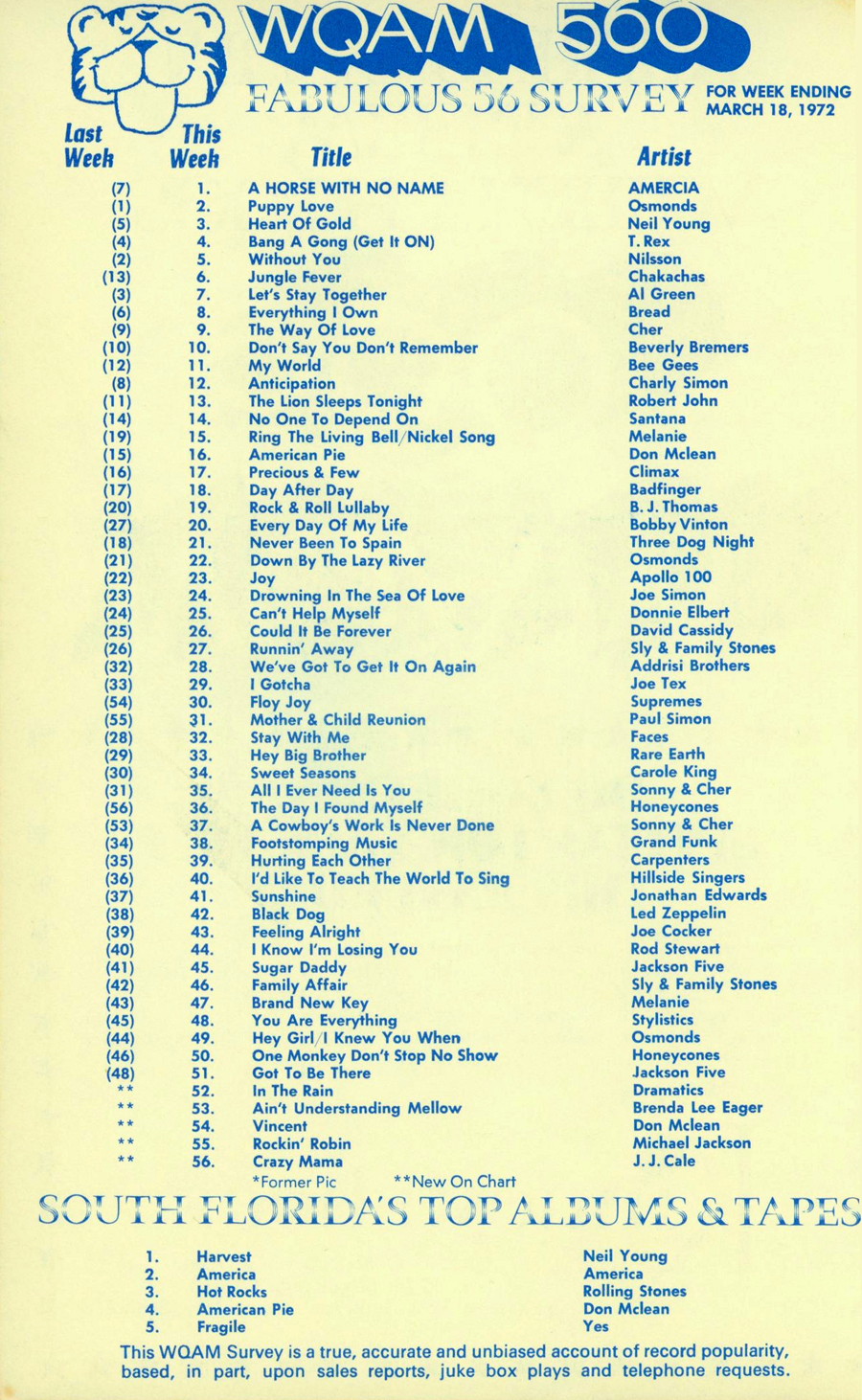 WQAM FABULOUS 56 SURVEY FOR WEEK ENDING MARCH 18, 1972 |