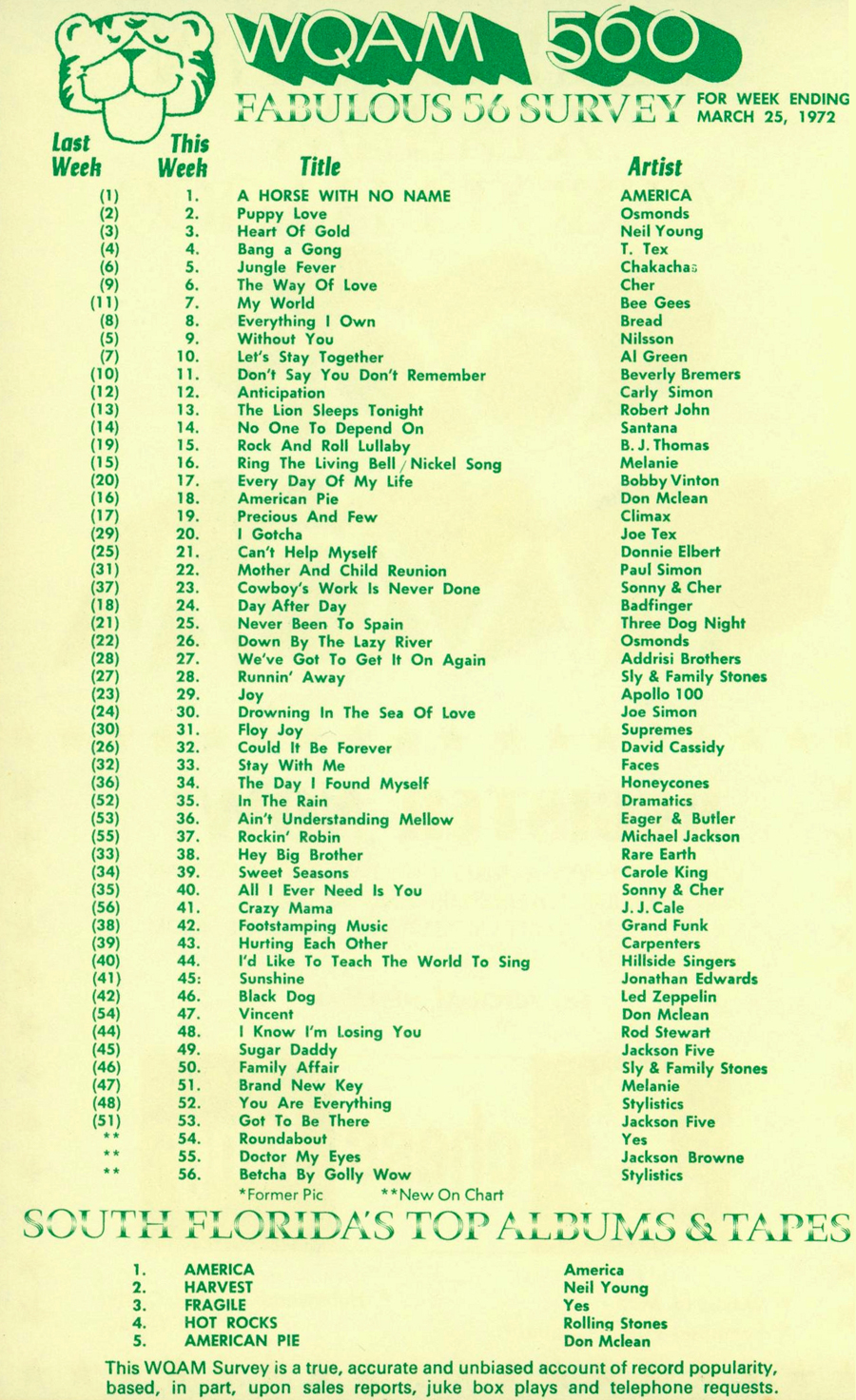 WQAM FABULOUS 56 SURVEY FOR WEEK ENDING MARCH 25, 1972 |