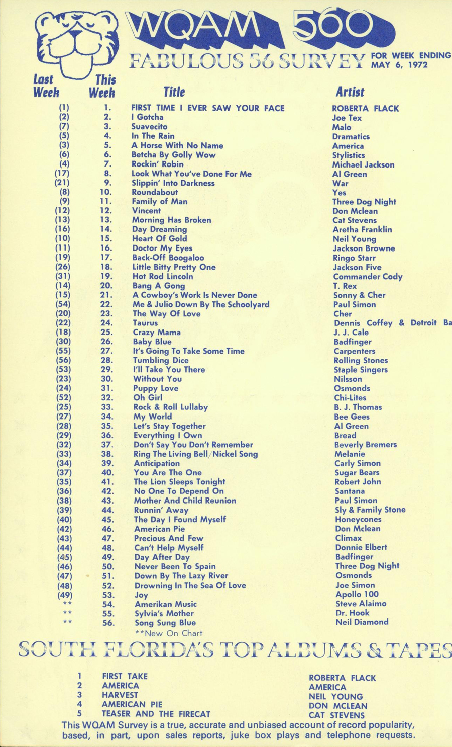 WQAM FABULOUS 56 SURVEY FOR WEEK ENDING MAY 6, 1972 |