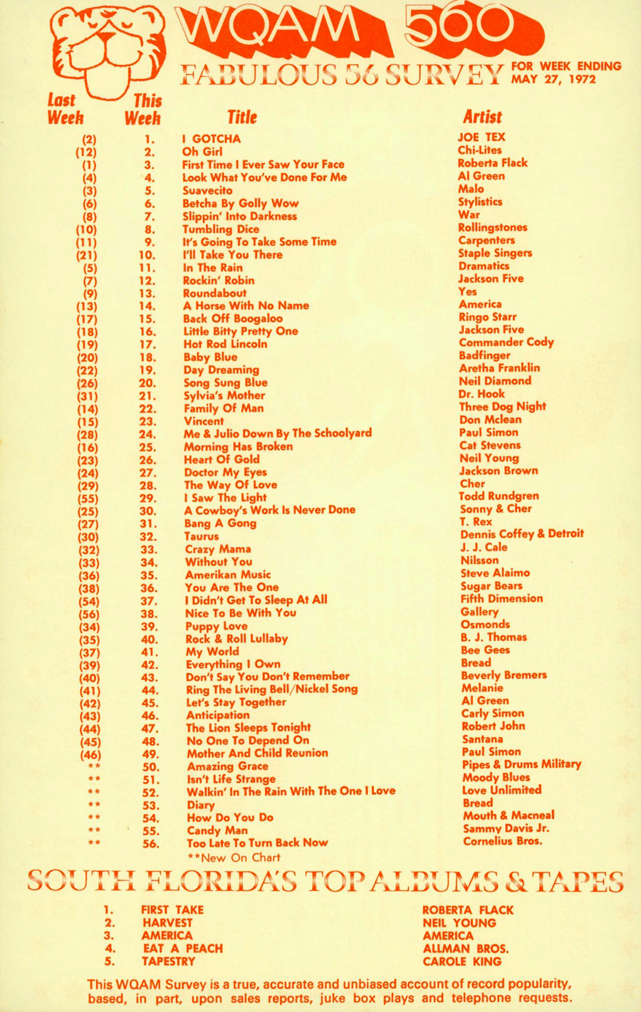 WQAM FABULOUS 56 SURVEY FOR WEEK ENDING MAY 27, 1972 |