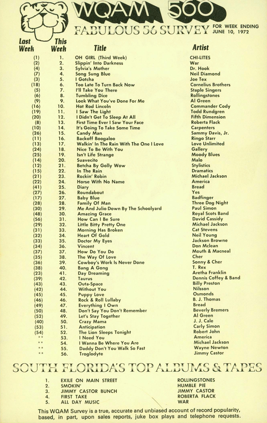 WQAM FABULOUS 56 SURVEY FOR WEEK ENDING JUNE 10, 1972 |