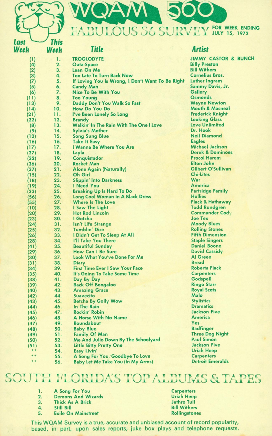 WQAM FABULOUS 56 SURVEY FOR WEEK ENDING JULY 15, 1972 |