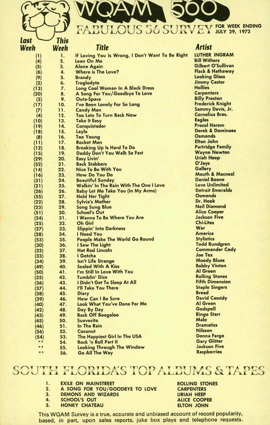 WQAM FABULOUS 56 SURVEY FOR WEEK ENDING JULY 29, 1972 |