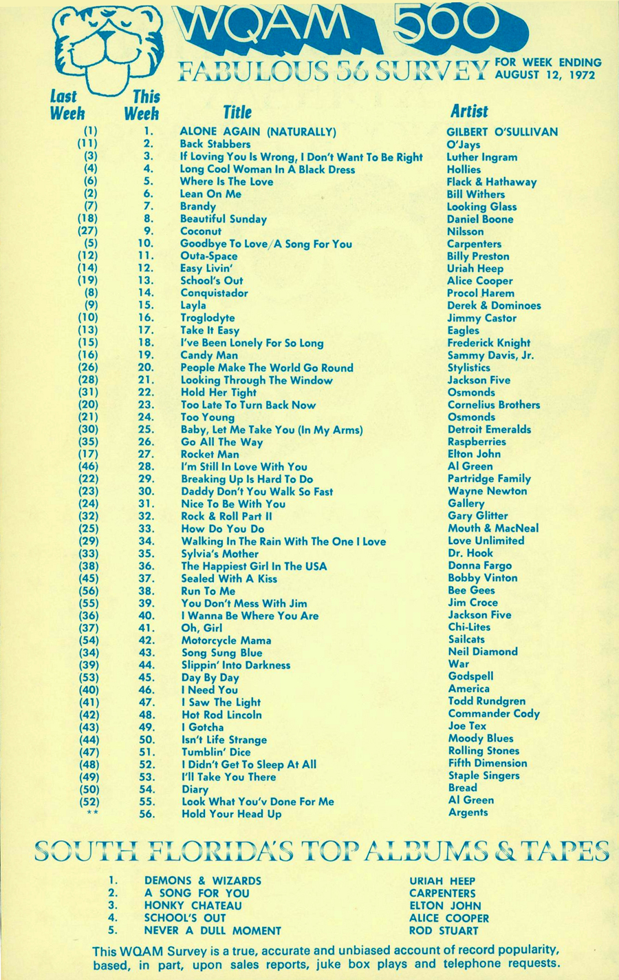 WQAM FABULOUS 56 SURVEY FOR WEEK ENDING AUG. 12, 1972 |