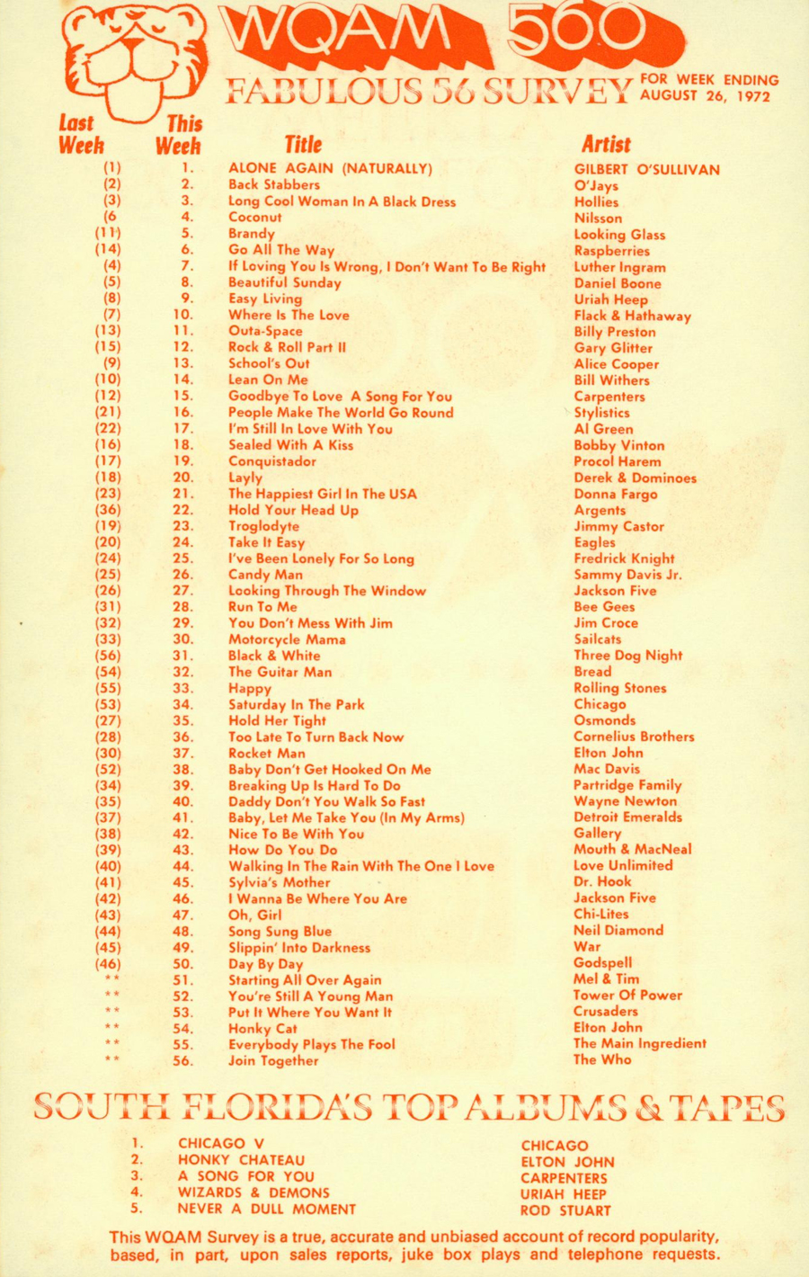 WQAM FABULOUS 56 SURVEY FOR WEEK ENDING AUG. 26, 1972 |