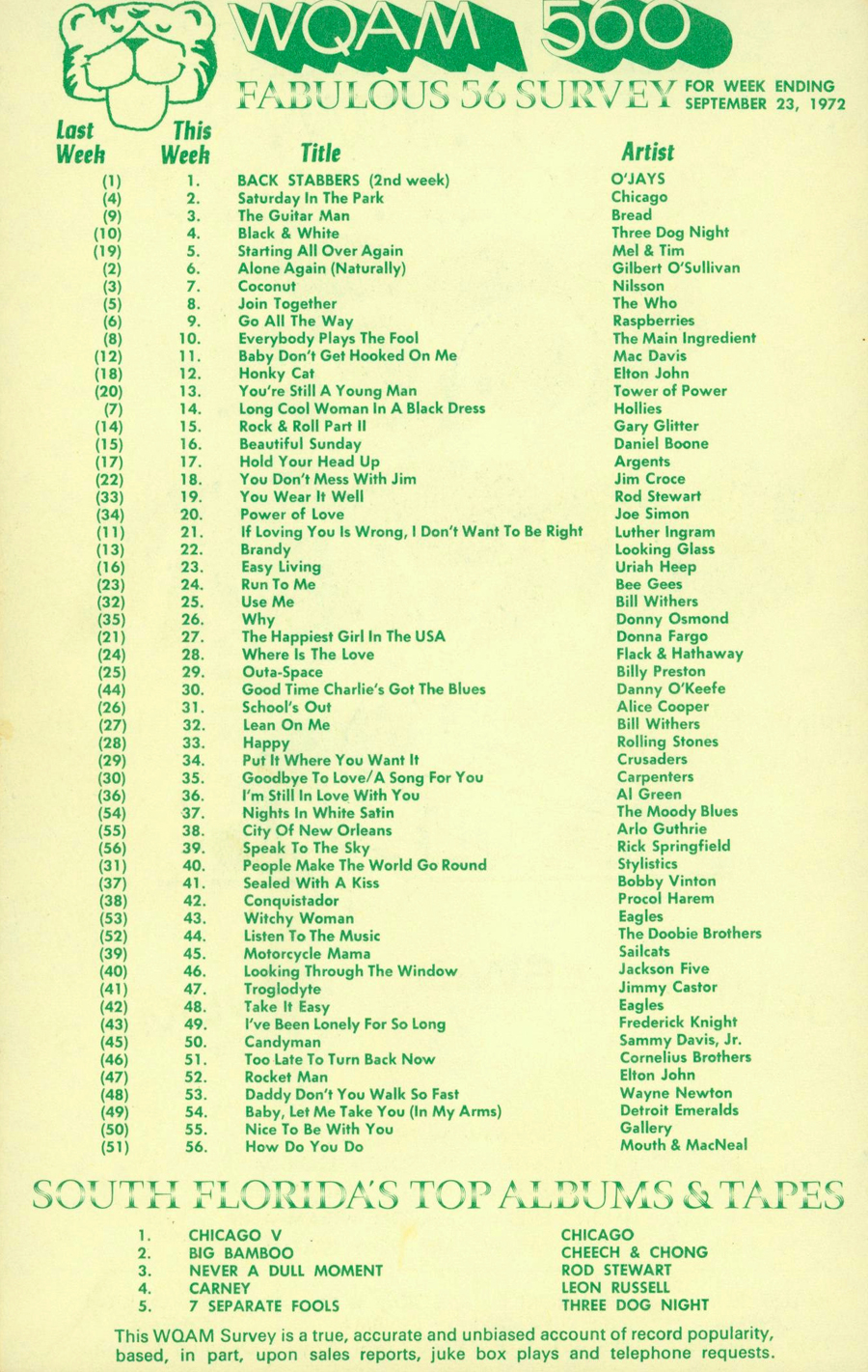 WQAM FABULOUS 56 SURVEY FOR WEEK ENDING SEPT. 23, 1972 |