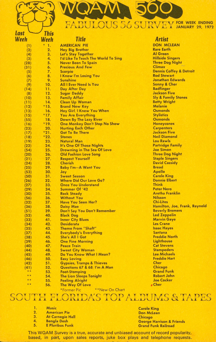 WQAM FABULOUS 56 SURVEY FOR WEEK ENDING JAN. 29, 1972 |