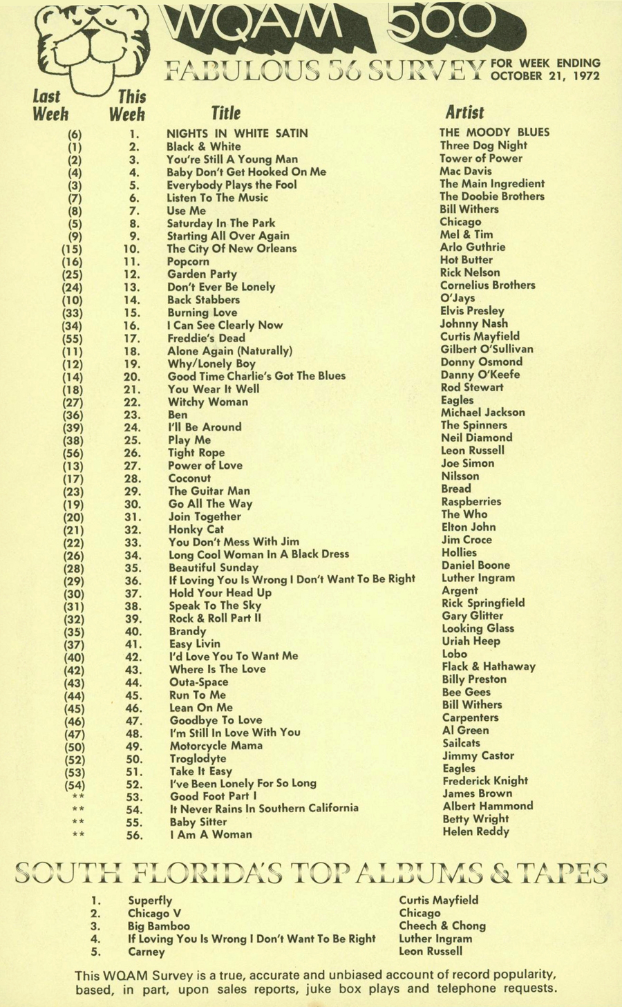 WQAM FABULOUS 56 SURVEY FOR WEEK ENDING OCT. 21, 1972 |
