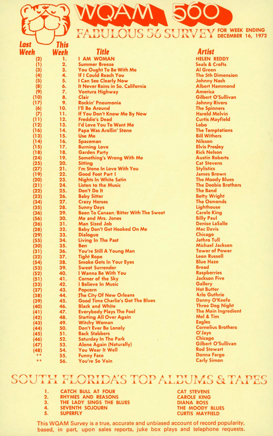 WQAM FABULOUS 56 SURVEY FOR WEEK ENDING DEC. 16, 1972 |