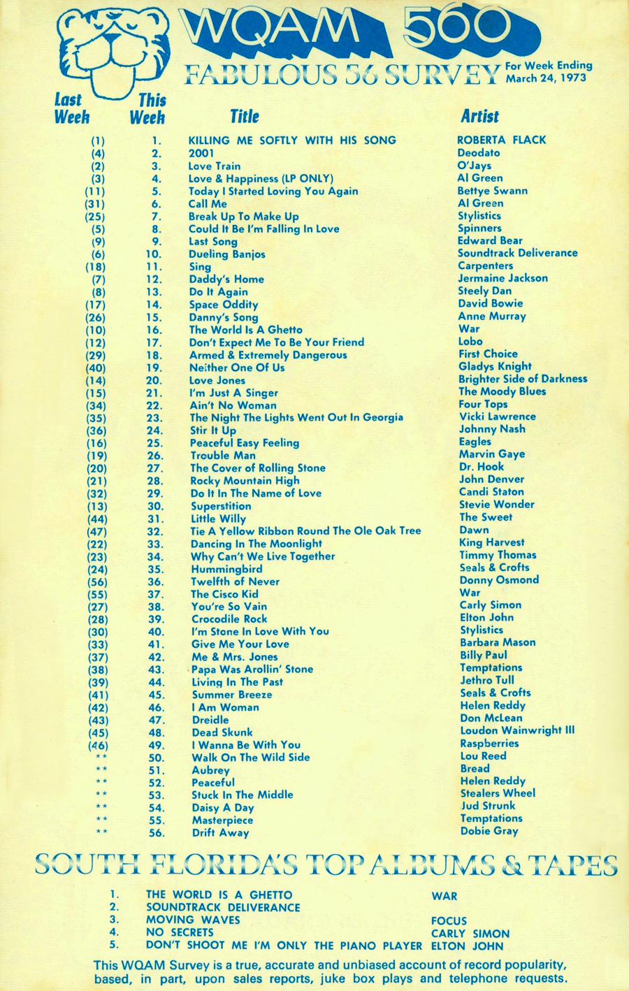WQAM FABULOUS 56 SURVEY FOR WEEK ENDING MARCH 24, 1973 |