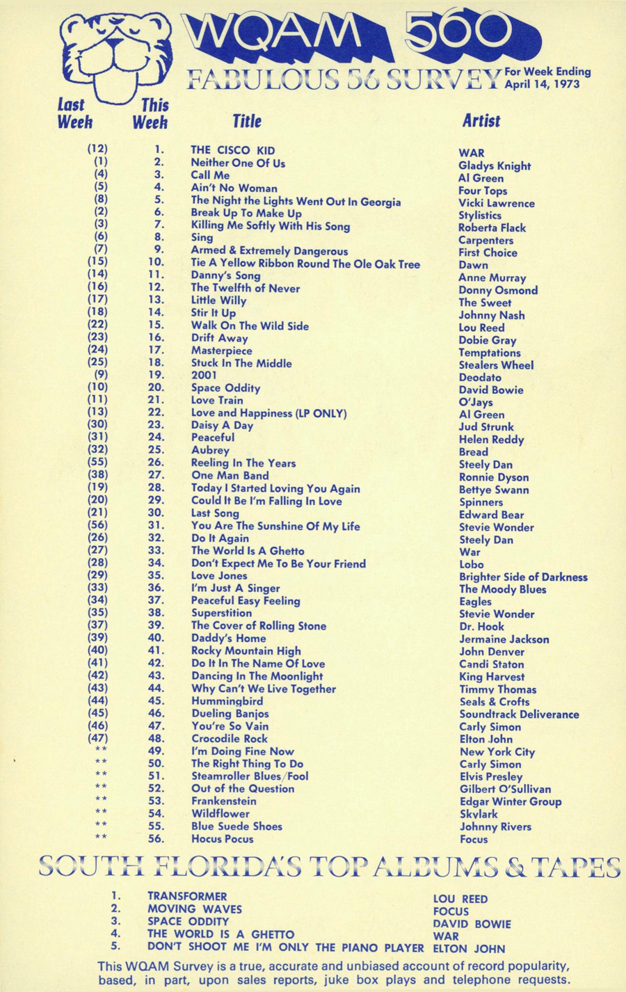 WQAM FABULOUS 56 SURVEY FOR WEEK ENDING APRIL 14, 1973 |