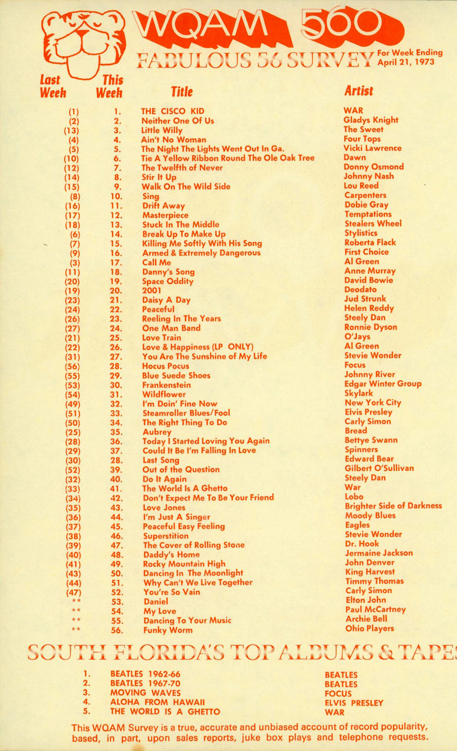 WQAM FABULOUS 56 SURVEY FOR WEEK ENDING APRIL 21, 1973 |