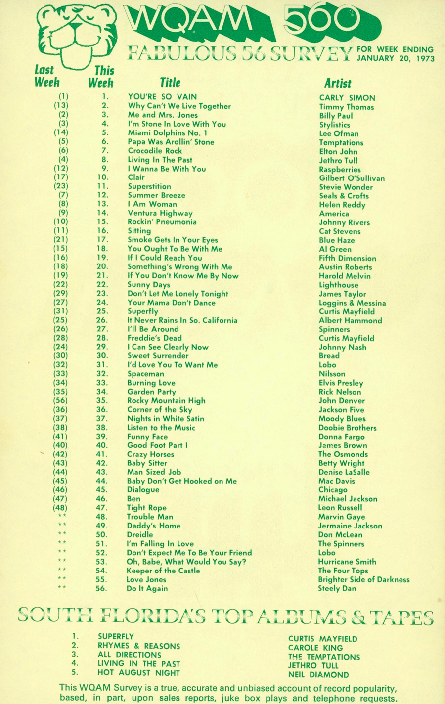 WQAM FABULOUS 56 SURVEY FOR WEEK ENDING JAN. 20, 1973 |