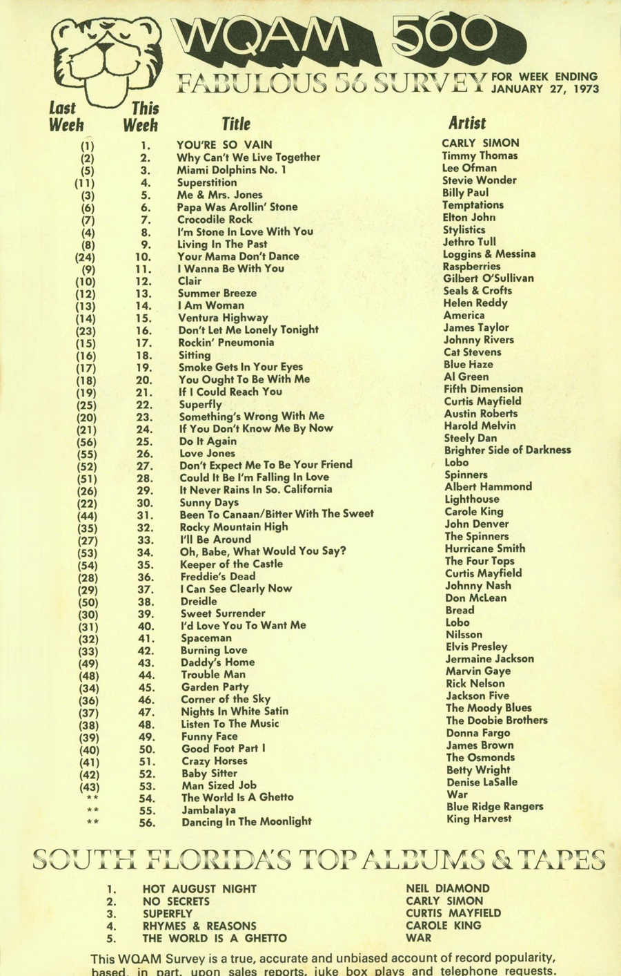 WQAM FABULOUS 56 SURVEY FOR WEEK ENDING JAN. 27, 1973 |