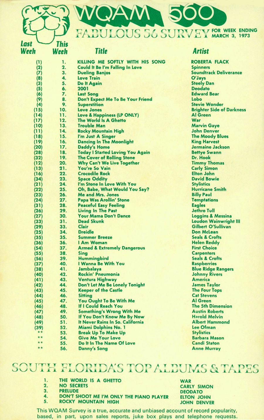 WQAM FABULOUS 56 SURVEY FOR WEEK ENDING MARCH 3, 1973 |