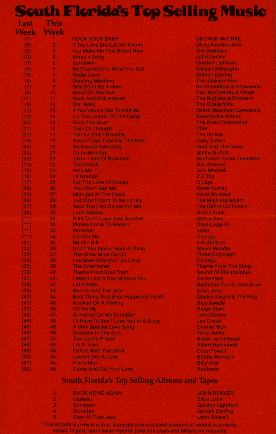 WQAM FABULOUS 56 SURVEY FOR WEEK ENDING JULY 6, 1974 |