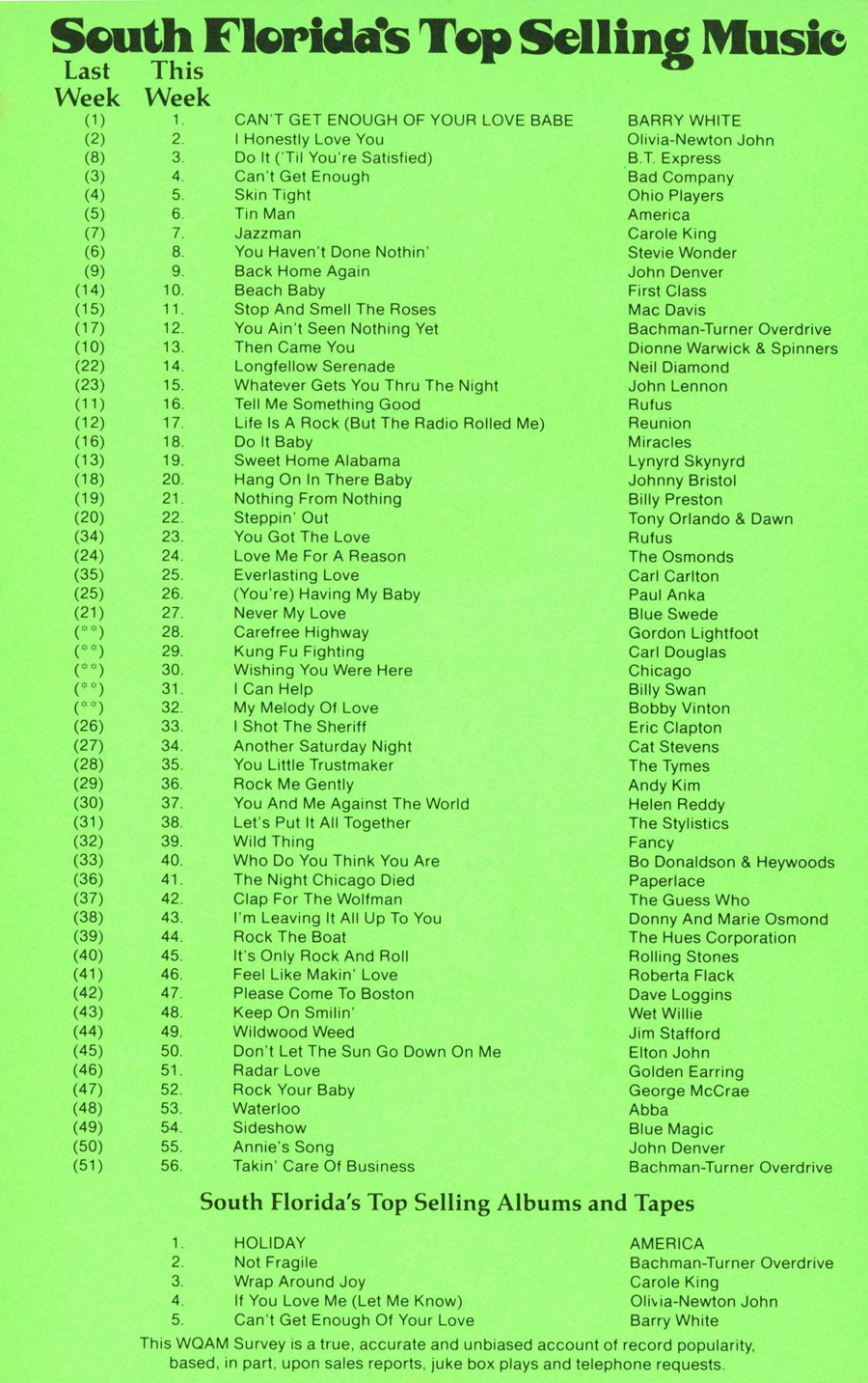 WQAM FABULOUS 56 SURVEY FOR WEEK ENDING OCT. 26, 1974 |