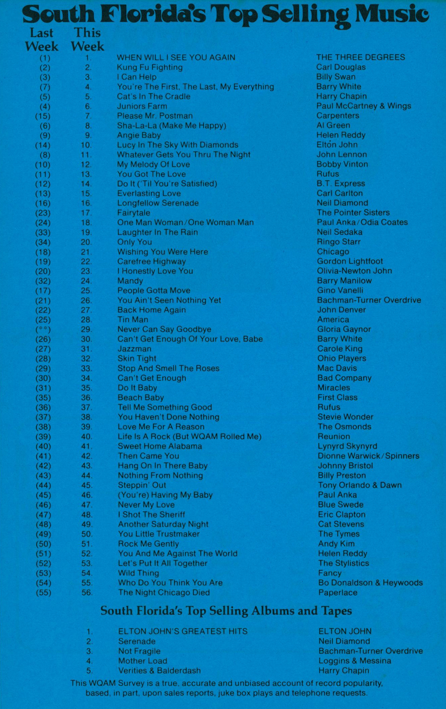 WQAM FABULOUS 56 SURVEY FOR WEEK ENDING DEC. 14, 1974 |